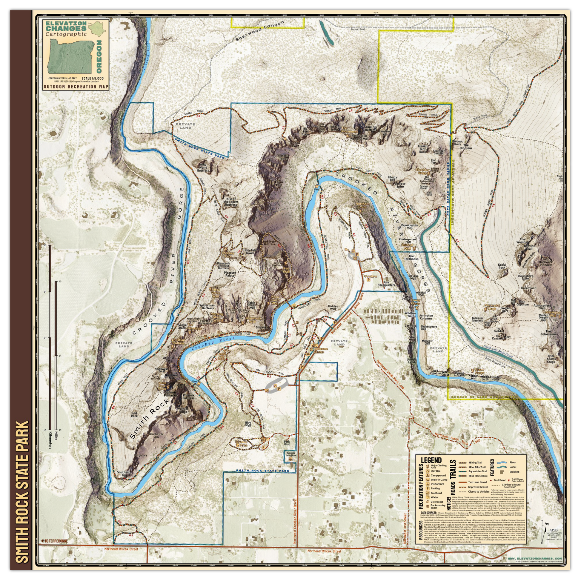 Smith Rock State Park in Central Oregon protects an outstanding outcropping of rocks where the Crooked River weaves through basalt cliffs and grassy, wildlife rich banks. The cliffs of the park are world class destination for sport climbing. This map highlights many of the climbing areas, user trails and features as they are known and referred to by climbers that been never assembled on a single map in such detail. So pair this with the local guidebook and head to the crags. Or explore the trails on foot, bike, or horseback!